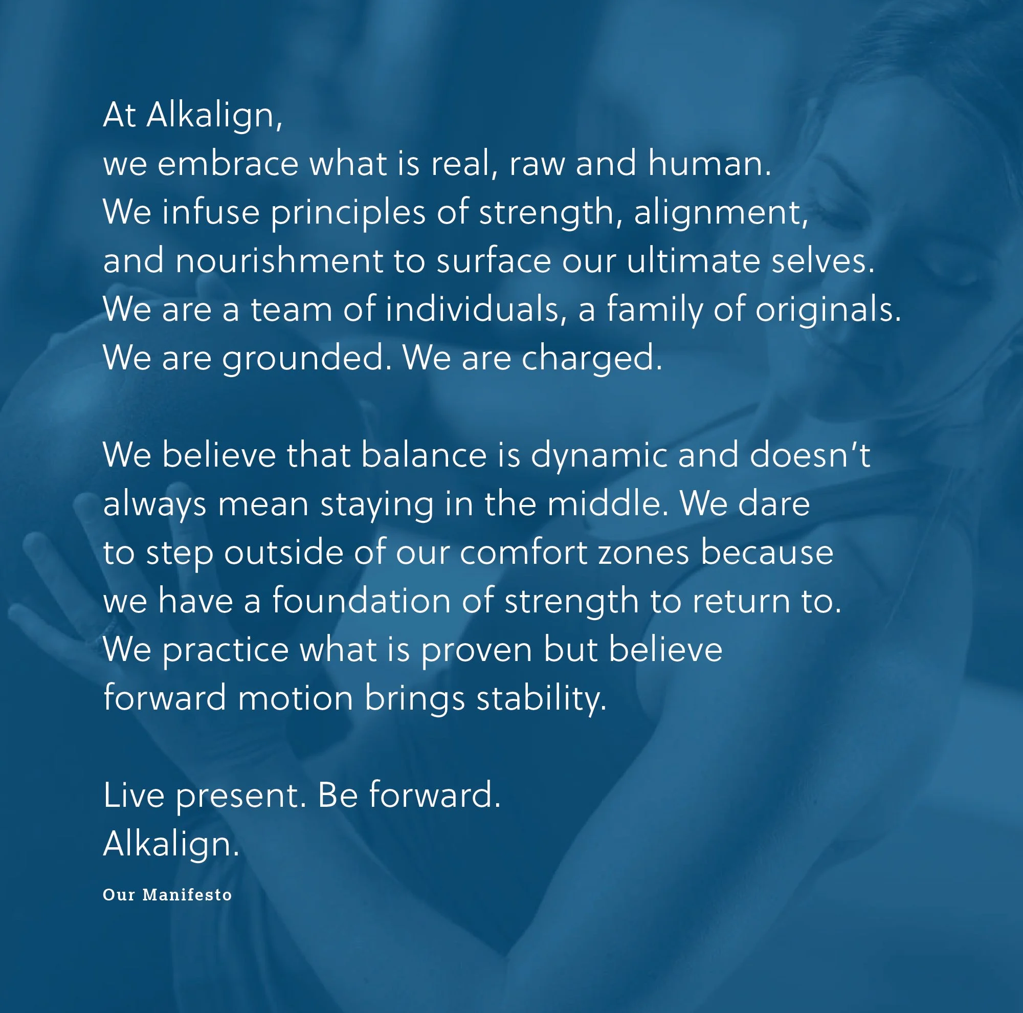 We combined “alkaline” (representing water, stability, balance, and the ideal pH state of your body) with our passion for alignment to form Alkalign.